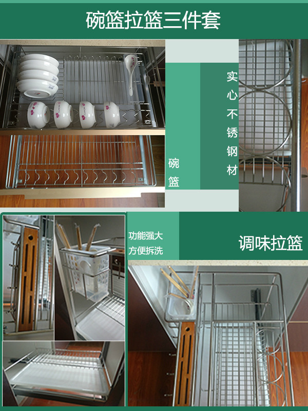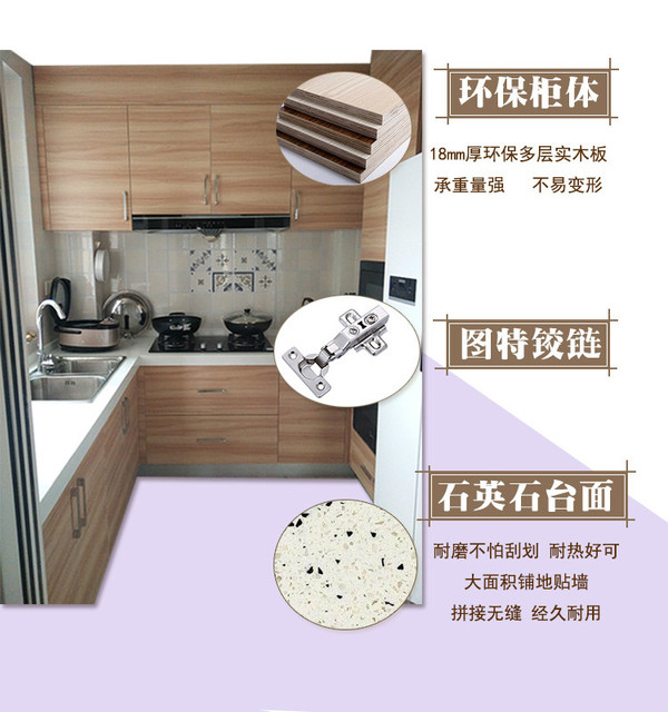 柜體平安樹實木多層板(桉木芯E0級),臺面石英石(單色),品牌圓管不銹鋼拉籃,碗籃,調(diào)味籃,品牌不銹鋼阻尼鉸鏈,拉手(樣式可自選)三組海蒂詩導(dǎo)軌抽屜。